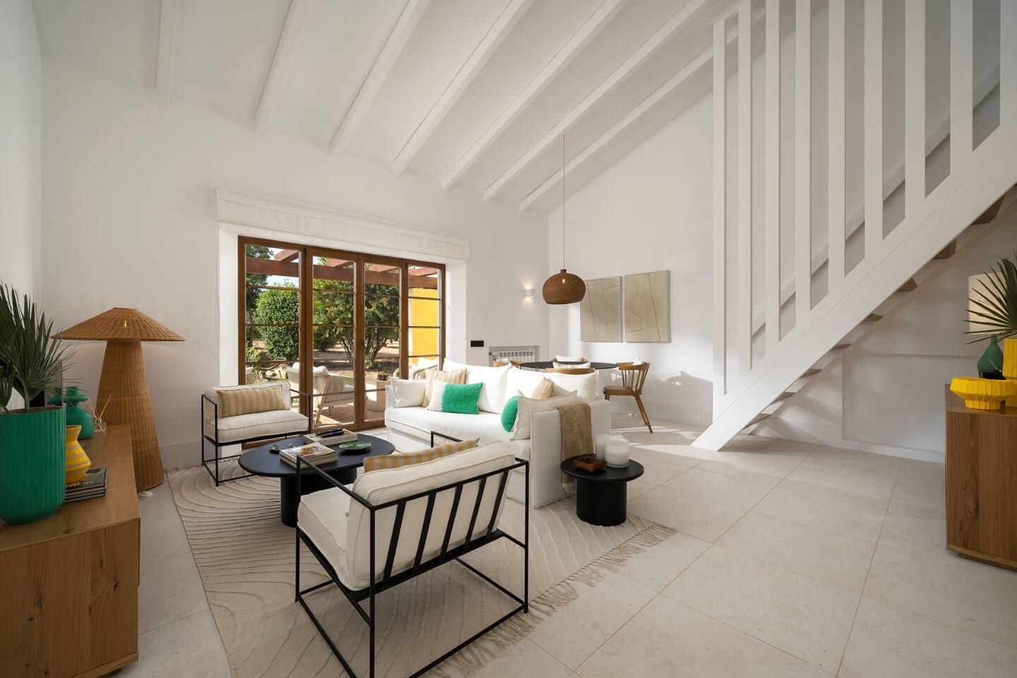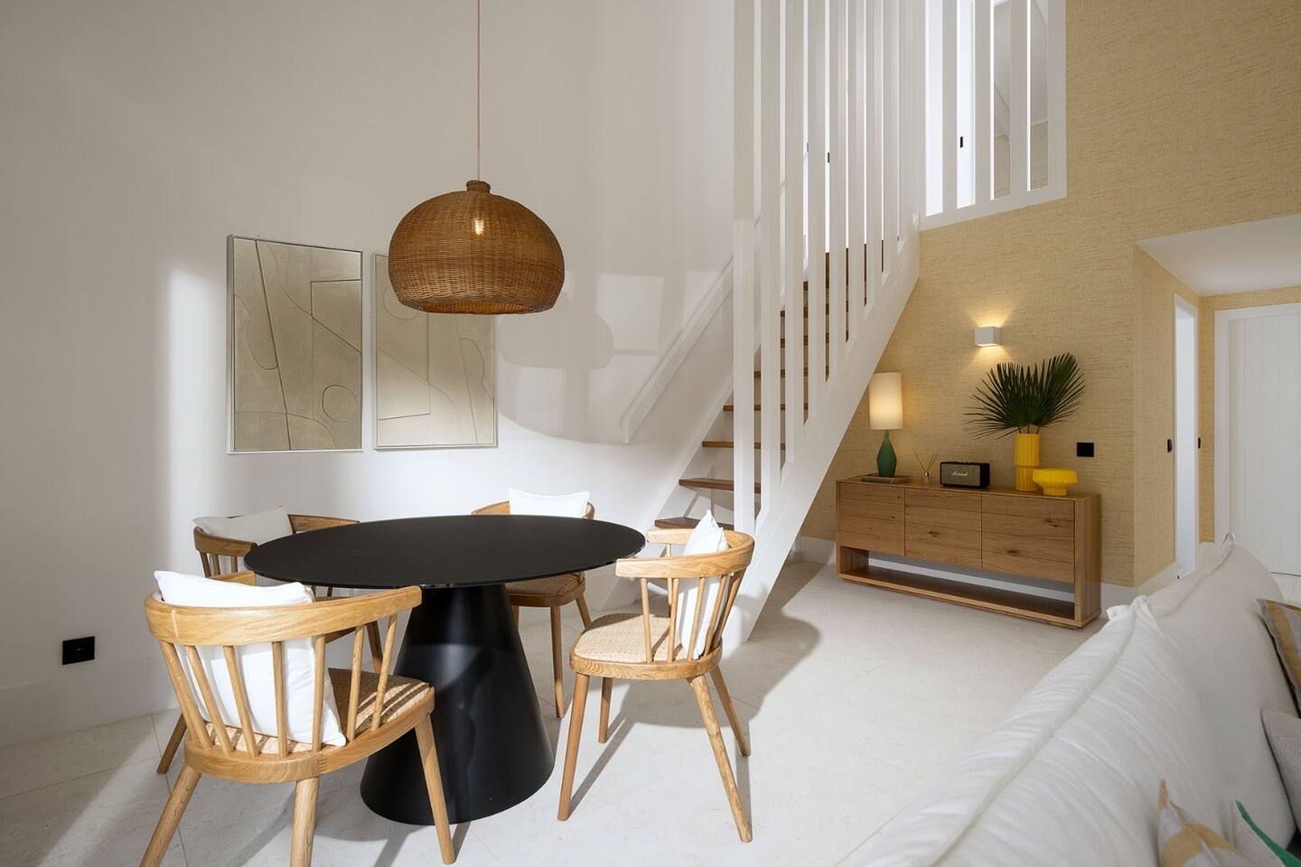 This bright two-story house offers two bedrooms and two bathrooms, thoughtfully arranged with one bedroom and bathroom on each floor for added comfort and privacy. The downstairs bedroom is spacious and sleeps up to three, featuring a king-size bed and a mezzanine single bed, along with a large bathroom with both a shower and a bathtub. Upstairs, you’ll find a cozy second bedroom with a king-size bed, plus a bathroom with a shower and toilet. The home features an open living area with a fully equipped enclosed kitchen, ideal for relaxed meals and evenings in. Outside, enjoy a private garden and patio with a small terrace, perfect for unwinding. Please note that the garden is not fenced. Guests traveling with dogs should keep this in mind and ensure pets are supervised at all times and do not enter neighboring gardens.